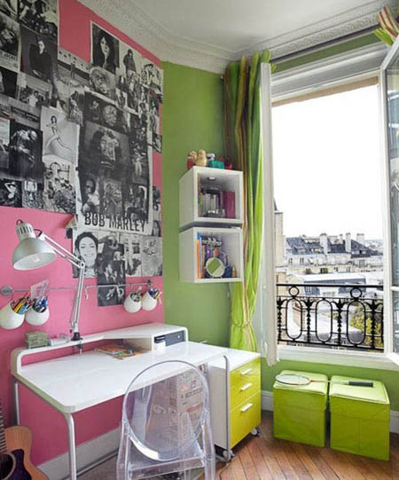 红色跟绿色两种颜色相隔较远,两种颜色都很清新,浅淡的粉红不甜腻,苹果绿的墙面漆又给室内增添了清新自然的感觉。